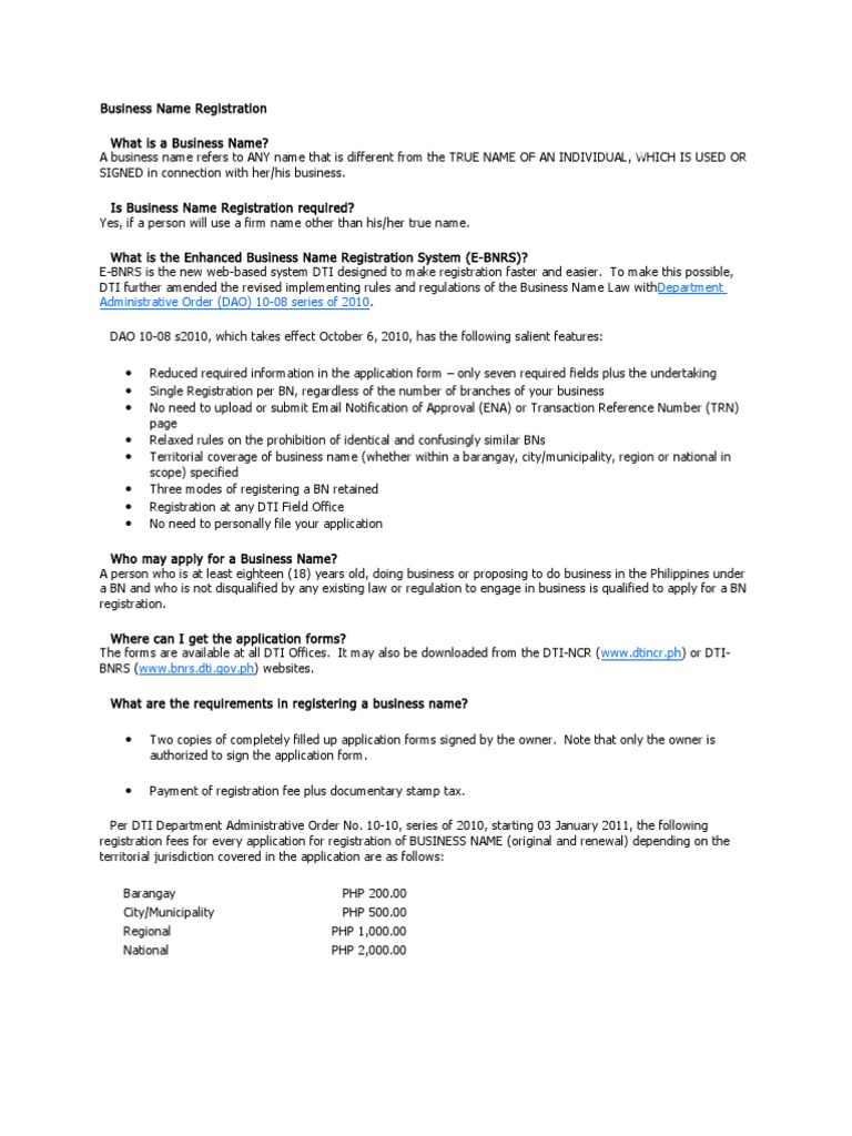 Application Form to do Business or Engage in an Economic Activity in the Philippines. Registering a business name and paying the fee can be done online at bnrsdtigovph. 2Register a Business Name.